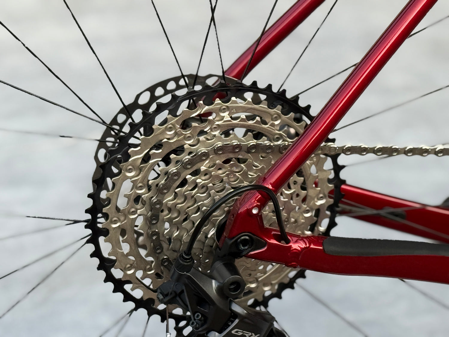 • Groepset: Shimano GRX 12‑speed – shifters/remmen GRX820, achterderailleur GRX822 (1x)