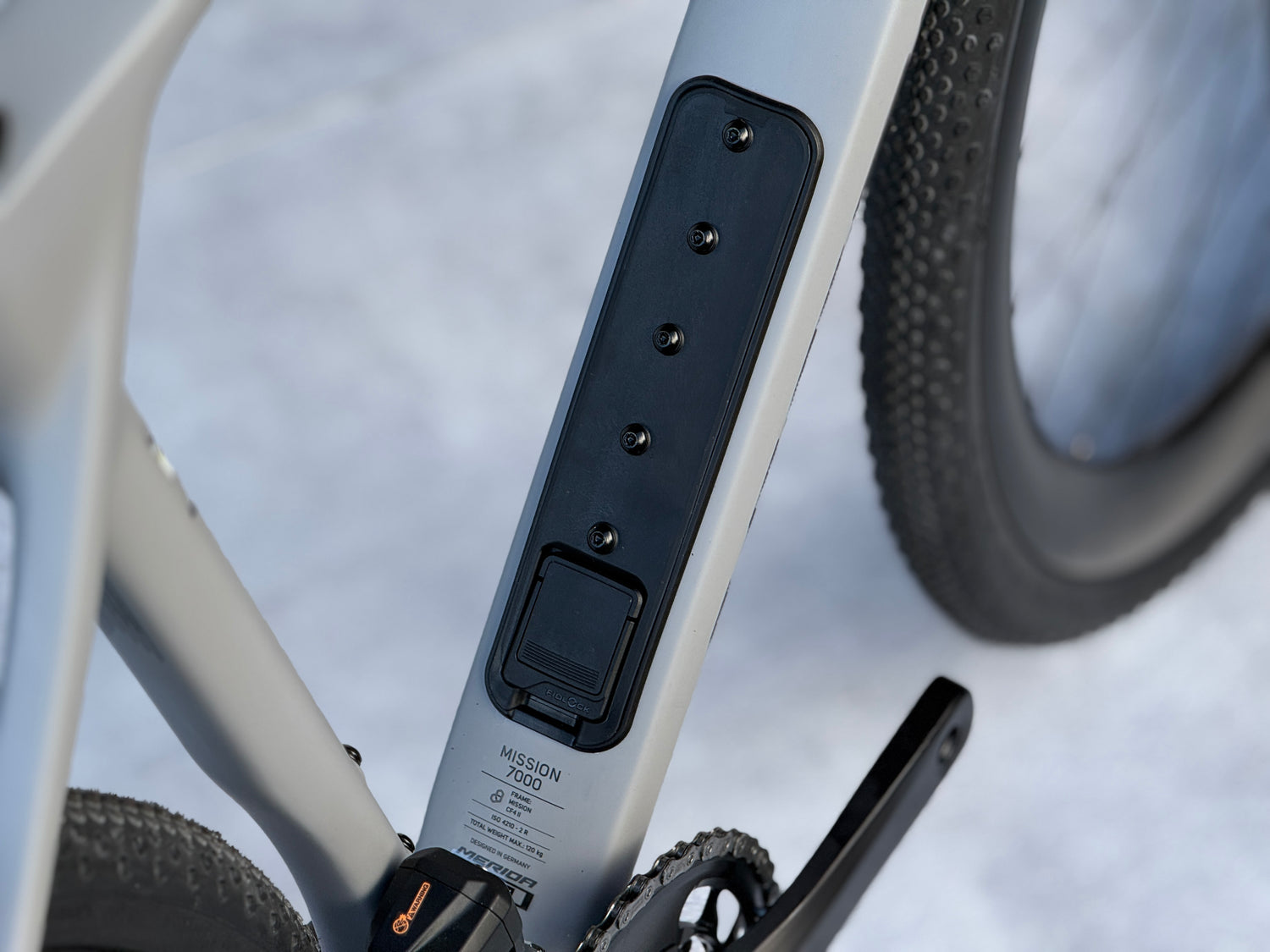 - Licht Mission CF4 II carbonframe met interne kabelvoering en opbergruimte in de onderbuis (Fidlock-deksel).