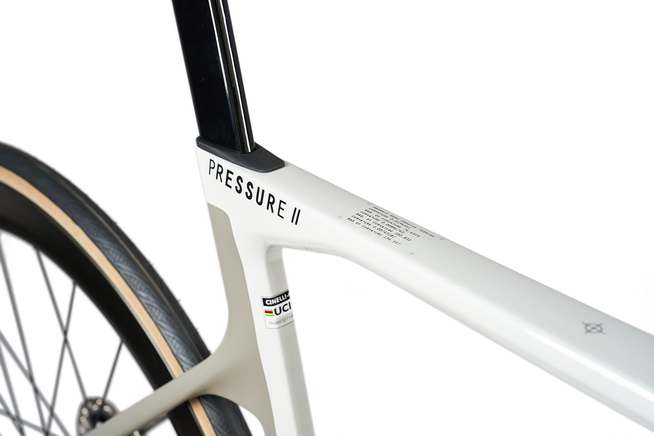 Born to race, Pressure is the pinnacle of Cinelli’s road bike design language. Obsessively re-engineered seatpost length, clamp mechanism and cable guides reduce the weight of the Pressure II framekit by 5% relative to its predecessor. Refined over 4 different samples the Pressure II’s carbon fiber layup represents what our R&D team and pro riders believe to be the best ratio between weight savings, race stiffness and reliability. In line with most recent studies in aerodynamics, rolling resistance and - most importantly - the continuous hybridization of the road bike, the Pressure II features 32mm max tyre clearance.